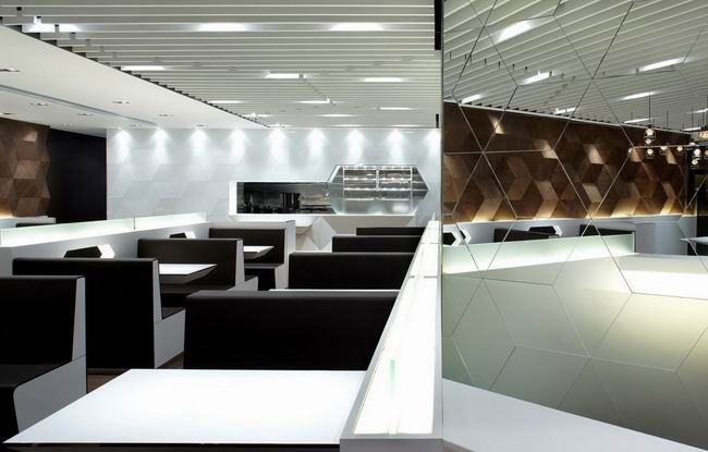 在整個咖啡館設(shè)計中,六邊形結(jié)構(gòu)的多重影像增強(qiáng)了空間的親密感,在整齊適宜的布局中又不失動態(tài)的變化。親善而富于變化的理念貫穿著每一寸的空間。