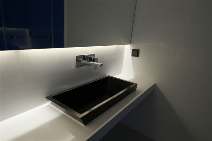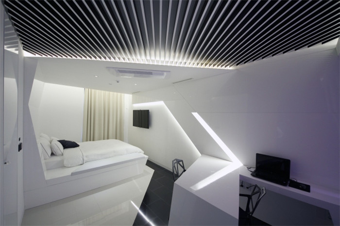 酒店客房空間以白色為主色調(diào),干凈明亮,紫色或藍(lán)色玻璃隔斷與燈光相互交匯,營(yíng)造出一種模糊而神秘的色彩,給客人帶來一種特別的體驗(yàn)。大多家具都被設(shè)計(jì)在一個(gè)L形的表面上,彼此相互獨(dú)立而又聯(lián)系在一起。