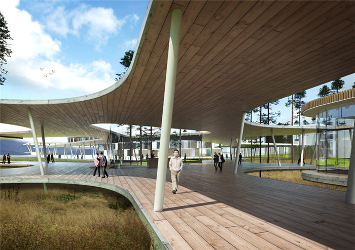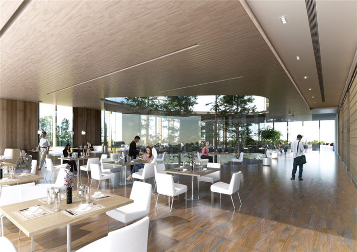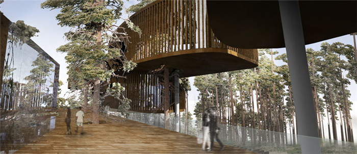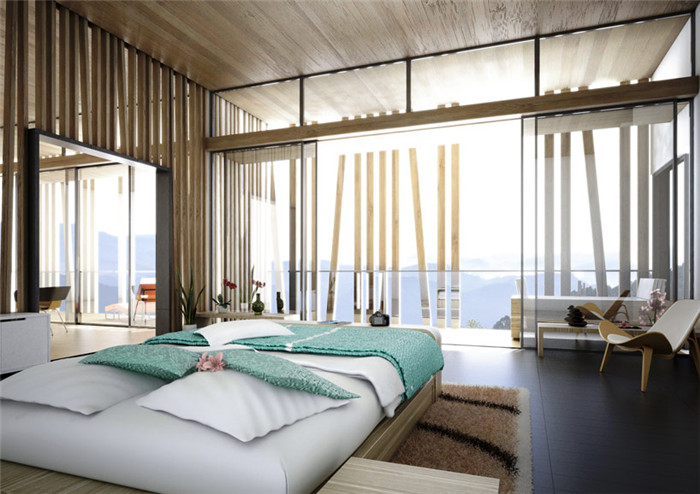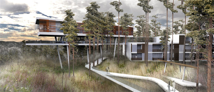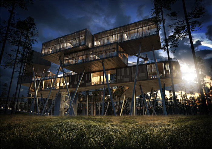 酒店空間設(shè)計(jì)運(yùn)用了底層空柱,給人一種失重感。柱子下面為人行道和分層平臺(tái)。酒店在森里里面還有有10座小別墅,可供客人休息和住宿。酒店客房室內(nèi)空間高雅大方、功能完善,透過透明的窗戶,可以直接在室內(nèi)欣賞到室外的景觀。