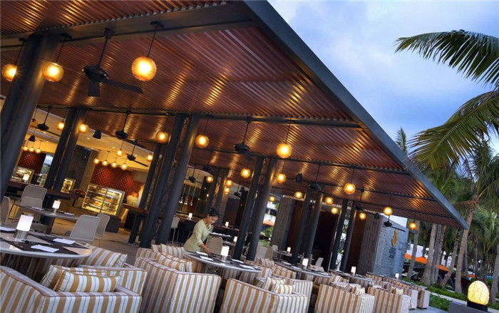 酒店設(shè)施齊全,不僅有別墅住房還有俱樂部、餐廳、水上花園等空間。所有的空間收割機(jī)都指向綠色花園的概念,而這種設(shè)計(jì)靈感恰恰來自于當(dāng)?shù)氐咎锏牟季帜J?。酒店結(jié)構(gòu)的外立面呈中性色調(diào),而是捏的同色、金色等色調(diào)剛好與之形成鮮明對比。