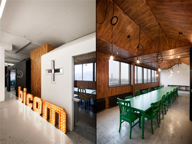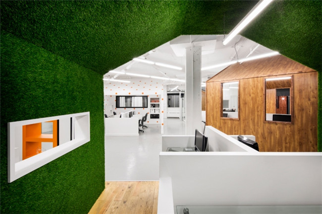 小房間另類的鄉(xiāng)村風(fēng)格成為了它的靈感來源,小房間經(jīng)常會(huì)喚起湖邊童年暑假以及營火的記憶,為什么不能擁有一個(gè)創(chuàng)造快樂回憶的辦公室?將墻壁和天花板都處理成了白色但是小房間依然保留了他們的視覺樣式,不論是假草、木隔板或者橙色的斑點(diǎn)。