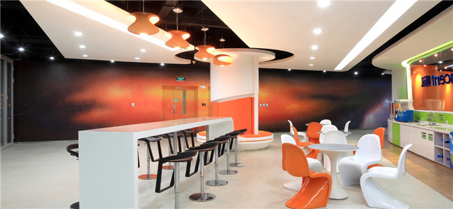 色彩上,辦公室設計不但延續(xù)使用了以往項目中常用的騰訊logo色系中艷麗的黃色和橙色,還增加使用藍色、紫色來表現宇宙主題。整體風格現代又不失穩(wěn)重,活躍又不失雅致。