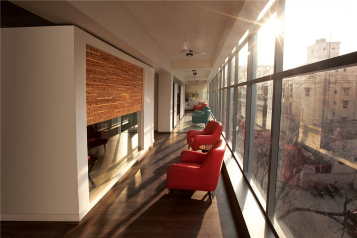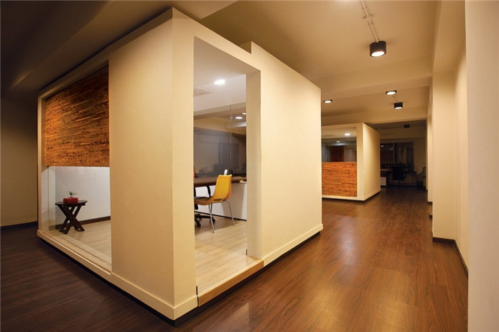室內(nèi)設(shè)計(jì)依據(jù)公司具體情況和客戶要求需要許多封閉的會(huì)議室、洽談室和靈感室等。這些封閉的空間或稱(chēng)之為“容器”被設(shè)計(jì)成“絕對(duì)伏特加酒瓶”,每個(gè)容器的墻面決定了它的特點(diǎn)。每個(gè)“容器”因?yàn)楦髯缘氖褂谜吆凸δ芏骶咛厣,F(xiàn)場(chǎng)所有木制品剩余廢料用于制作一個(gè)裝飾面,表面不作什么處理。