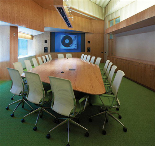 從大門進(jìn)入,穿過主要樓層,一種強(qiáng)烈的抵達(dá)感在兩間會(huì)議室得以延續(xù)。橡木鑲板和復(fù)雜的織物面料形成的天花板給人一種莊嚴(yán)肅穆之感。對(duì)面出門就是幾英尺高的坡道:會(huì)議室就像一個(gè)中心擺放了壓克力會(huì)議桌的高臺(tái),圍墻的下半段均以玻璃制成,在外部看來就像是帶形條窗。整體看去,整個(gè)辦公室好像鋪了一層天鵝絨。