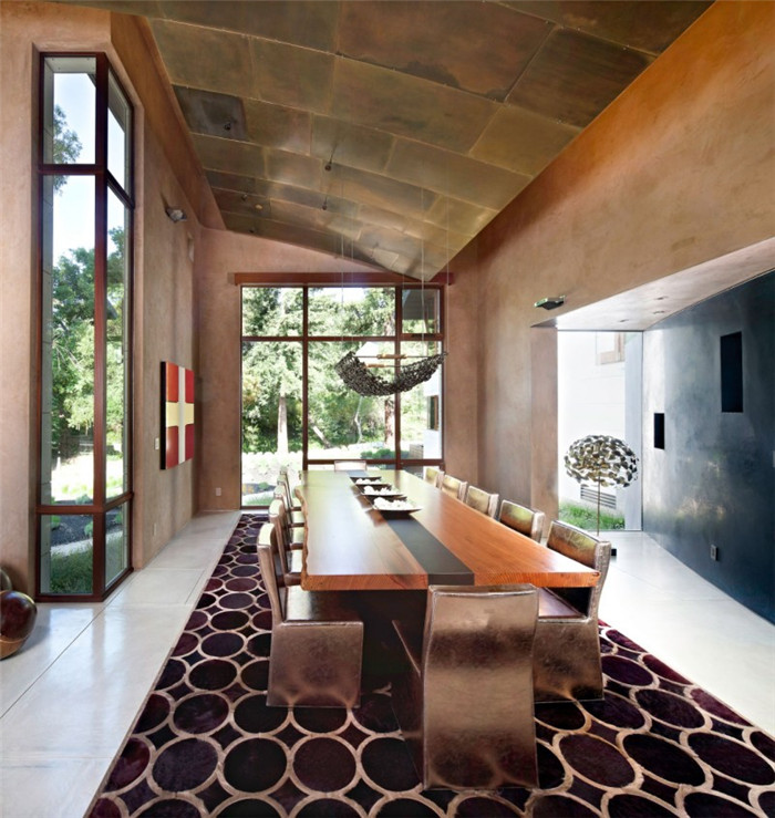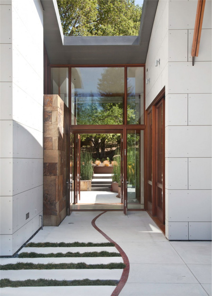 別墅的存在不僅沒有破壞周圍的自然環(huán)境,反而有益于保存和優(yōu)化橡樹林和小溪的生存條件。別墅由玻璃走道和拱頂相連,還有庭院和室外空間將別墅與周圍的美景融為一體。小路南邊盡頭有一個(gè)雕塑平臺(tái),而其設(shè)計(jì)靈感便來自于小溪。室內(nèi)拱形天花板處還有青銅板拱腹。