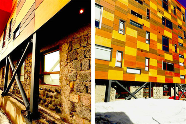 酒店外觀是原來的構造,別具一格,再加以裝修設計形成了現(xiàn)在的彩色的拼接模塊。設計者還設計了一個石墻,把懷舊信息與現(xiàn)代元素很好的結合在一起。酒店空間寬敞、明亮且別具時尚,在這里客人還可以看到世界最驚人的雪山。