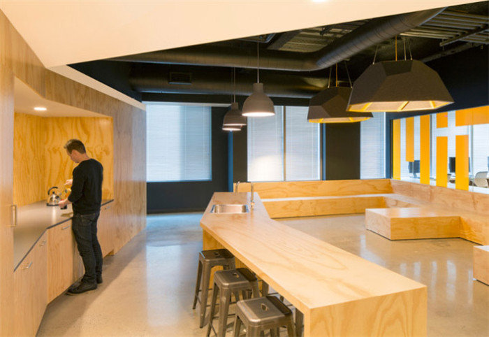 以毛氈與松木定制的超大尺寸幾何燈具與溫暖的松木交相呼應(yīng),明亮的黃色點(diǎn)綴其間,一個(gè)溫馨而積極的交流空間躍然眼前??蒲泄ぷ魇液挽`活可變的教室位于咖啡區(qū)的側(cè)翼,有利于促進(jìn)學(xué)生、教職員工和研究人員之間的互動合作。