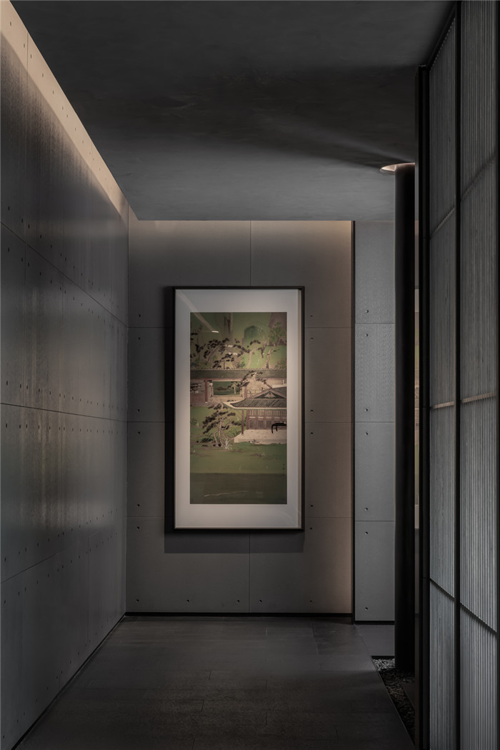 餐廳以清、幽、雅示人,暗下來的光影與外部相比顯得深沉而獨(dú)。特殊的入口設(shè)計(jì),首先讓食客的腳步慢下來,以謙遜的姿態(tài)互相感受。入口處靜立著的“拴馬樁”更具儀式感,有“迎客下馬”之意,又賦予空間古典的內(nèi)涵。