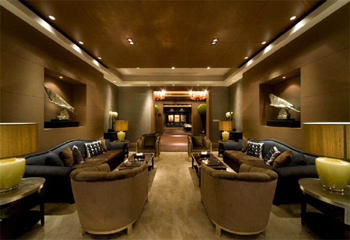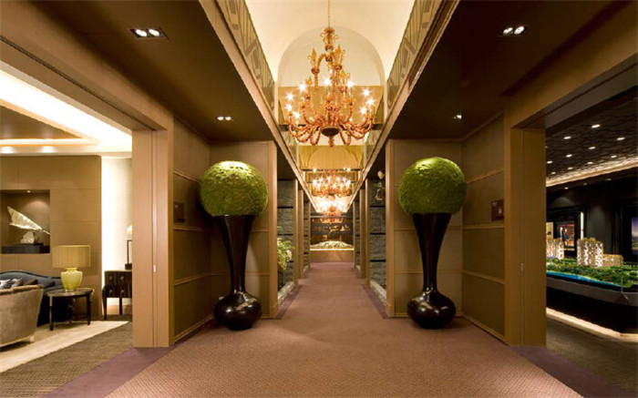 整個(gè)銷售空間以咖啡色為基底,大量的大理石、金屬和鏡面硬性材質(zhì)與壁紙、皮革、地毯等軟性材質(zhì)的有機(jī)結(jié)合,配上幾何圖形與具有裝飾性的家具、飾品的完美點(diǎn)綴,使得整個(gè)空間在實(shí)用的基礎(chǔ)上更富裝飾性,同時(shí)也完美演繹了Art-Deco現(xiàn)代傳統(tǒng)又不失摩登時(shí)尚的獨(dú)特魅力。