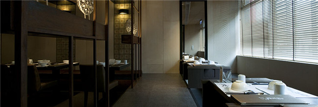 餐廳空間各面向強烈的垂直水平關(guān)系,重復(fù)著大面積墨色鏡面與木結(jié)構(gòu)框架座席,象征店家對料理一絲不茍的專注及井然有序,同時營造優(yōu)雅具現(xiàn)代感的空間氣氛。