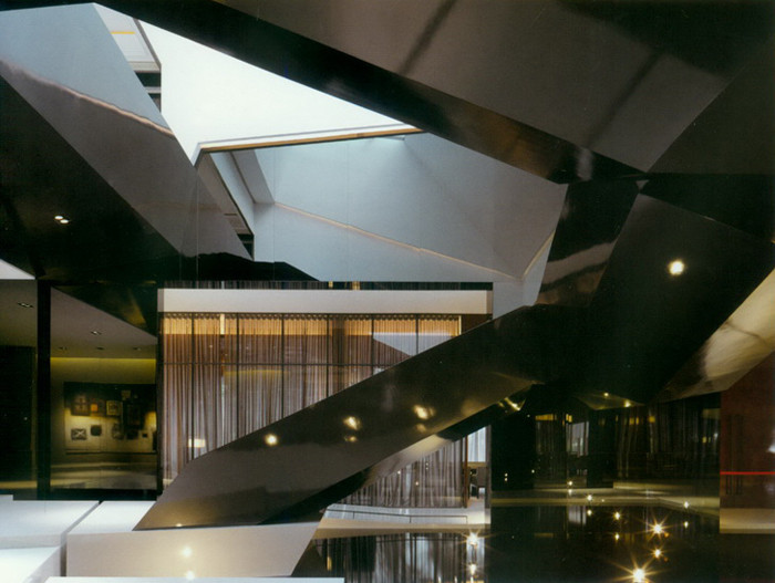 設(shè)計師從一開始就希望高低起伏的景觀能由外向內(nèi)延伸,創(chuàng)造一個地景與建筑型態(tài)交融的空間。由外而內(nèi)緩升的坡道帶動視覺的流動,貴賓室、柜臺、吧臺都在形體上化為抽象的山水,而水由外部不經(jīng)意地流進(jìn)室內(nèi),在墨鏡的交錯運用下,產(chǎn)生夢幻般的效果。