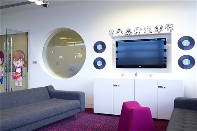 Playfish倫敦辦公總部辦公室完全詮釋了公司的業(yè)務(wù)文化,縈繞著卡通、可愛、有趣的氣氛,很有個性和創(chuàng)意!在這樣的辦公場所里你會見到很多游戲里的卡通角色,明亮純凈的色彩、可愛的寵物形象、光亮的墻體、造型各異的窗口,好像走進(jìn)了卡通世界一般,繽紛而絢麗、夢幻奇妙。