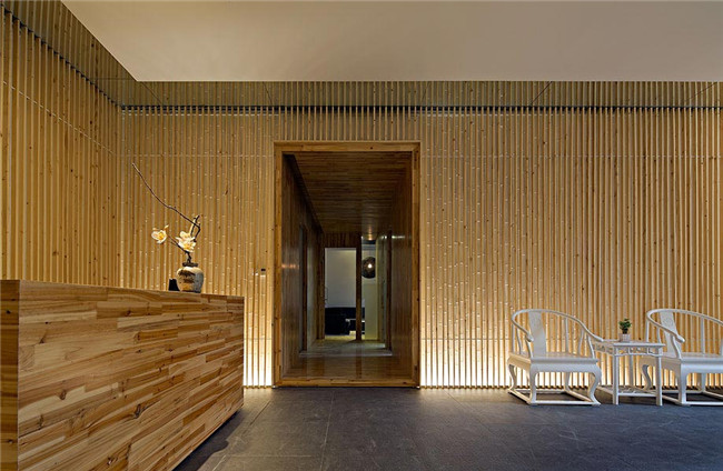 進(jìn)入辦公室我們首先看到的是一個(gè)由杉木和柱子裝飾的前廳,有層次的豎條形和低位光源的設(shè)置讓人馬上能體會(huì)到空間的細(xì)膩和寧?kù)o,猶如在從林中漫步一樣。