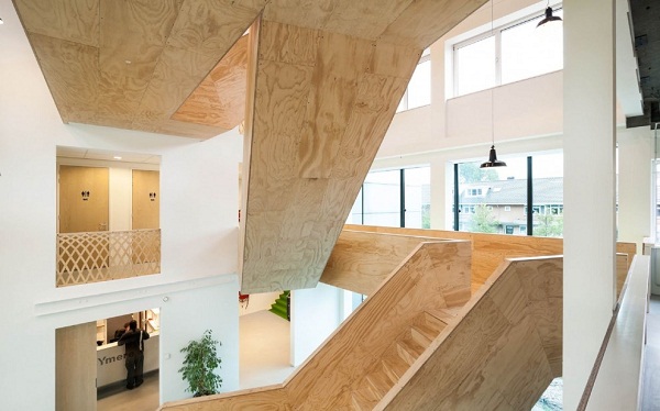 建筑原本的結(jié)構(gòu)過于傳統(tǒng),為此,設(shè)計師首先要做的就是打破呆板。他們希望建立一個共享的空間,可以將所有租客聯(lián)系起來。他們在建筑的核心區(qū)域開辟出空間,插入一個貫穿上下14米的大型樓梯,它以對角線的形式在空間中穿插,成為了建筑最醒目的建筑身份標(biāo)識。樓梯連接了餐廳、咖啡吧、會議室和各個小工作室,是空間中的活力地帶。