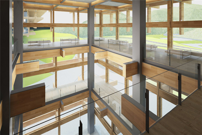 辦公樓內(nèi)部采用的是環(huán)形設計,與網(wǎng)格狀的外觀設計相呼應,整齊有序。外觀設計運用了玻璃,利用玻璃的反光效果,以保證自然光線進入室內(nèi),讓室內(nèi)顯得格外開闊,與室外自然環(huán)境連接了起來。