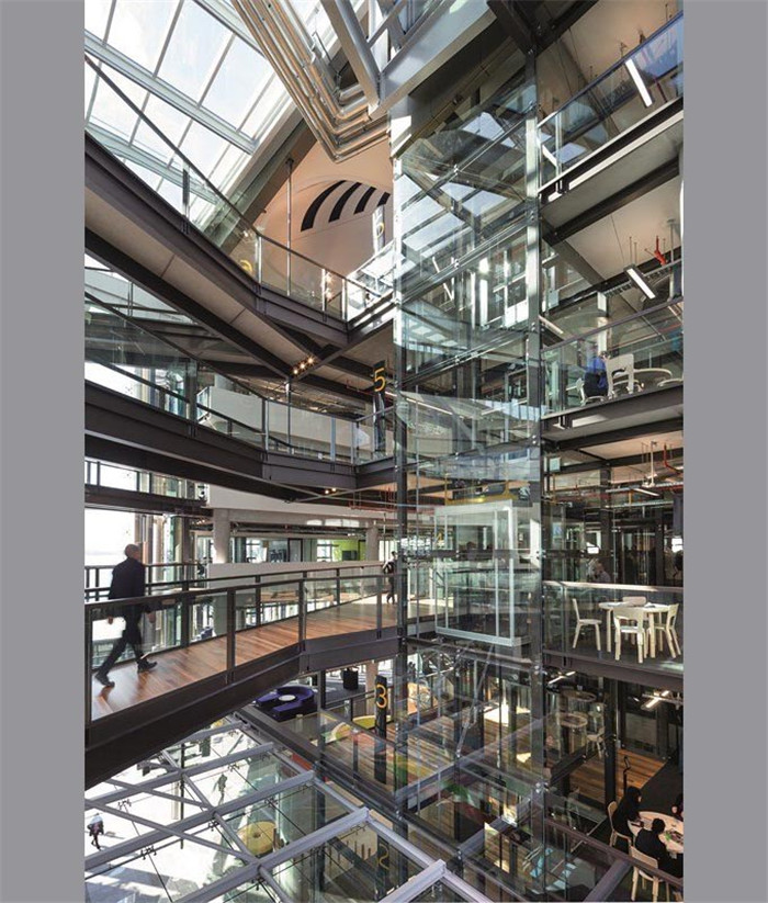 兩棟七層高的大樓由跨越中央走廊的多層玻璃走廊鏈接起來。這樣就使辦公內(nèi)部空間聯(lián)系起來,并形成一個特別空間。從正窗口進來的空氣可以通過風(fēng)管進入頂部,形成交叉通風(fēng)口。也反映了ASB設(shè)計的可持續(xù)發(fā)展措施。