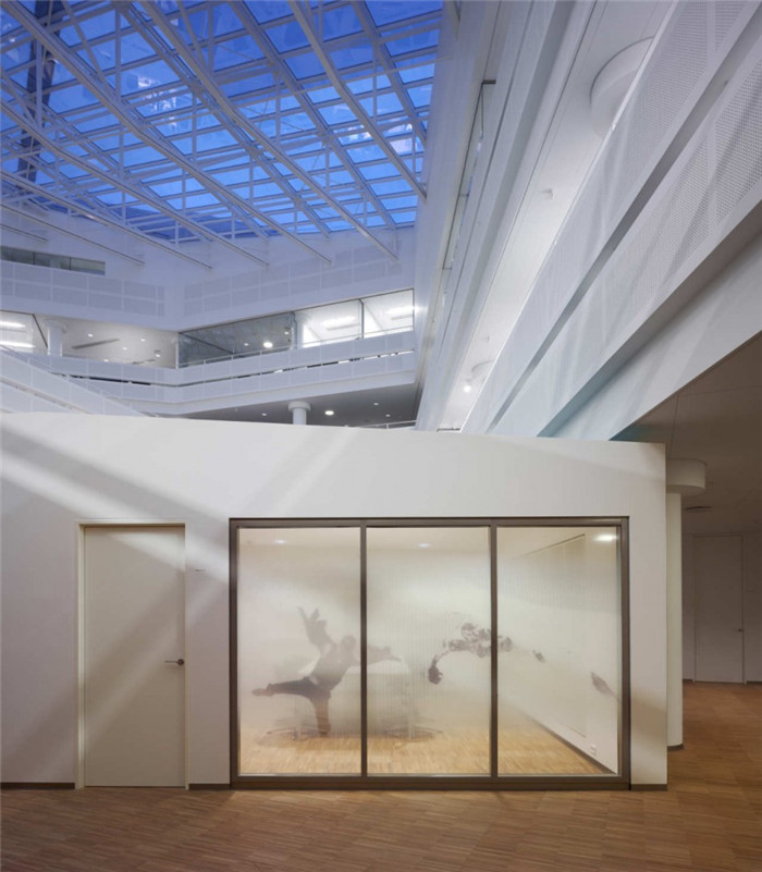 三葉式交叉體的建筑形式內(nèi)部形成了中庭區(qū)域,每一座都是周圍開放式的辦公空間的焦點(diǎn)。三座中庭風(fēng)格雖然相似,卻各有不同。而跨越中庭的步行橋在視覺上給人以動感,它是穿越樓層的最快路徑,有利于公司各部門之間的通力協(xié)作。