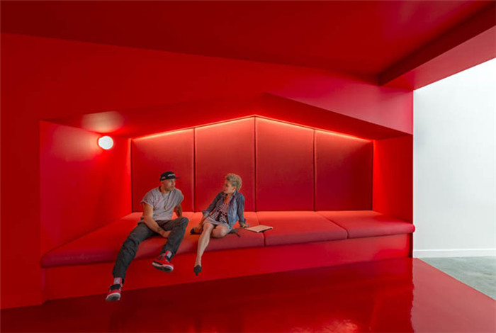 接近走廊的區(qū)域全部為紅色,墻壁嵌入功能性的軟墊座椅,在建筑中心處,木制樓梯與潔白墻面相鄰而設(shè),位于咖啡廳的對面。使用木材營造出一種溫暖的氛圍,天然材質(zhì)讓人感覺親切,令在其中工作的人們就像身處家中。