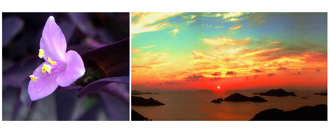 自然景觀中學搭配:在傍晚太陽光的照射下,天空呈現出色彩絢爛的景象,各色度紅色形成同類色對比,而紅色晚霞和藍的天、地面的草地形成一種強烈的對比。如此醒目、強烈、興奮的色彩配色只自然才能完成,讓人感覺是一位美麗的赤霞仙女穿著火紅的裙子向你走來。