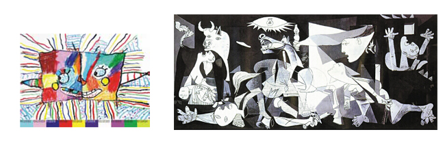 畢加索的名畫《格爾尼卡》,采用分解立體構成法,僅用黑、白、灰三種無彩色來完成。調子陰郁,情景恐怖,全畫充滿著悲劇氣氛。這是畫家對戰(zhàn)爭暴行的控訴,對人類災難的同情。
