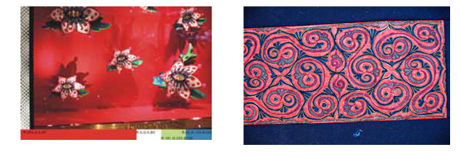 中國的苗族刺繡色彩艷麗,但是絕少的使用高飽和度的色彩,這種彩度和明度都相對低一些的色彩組合,顯得比較貴氣。