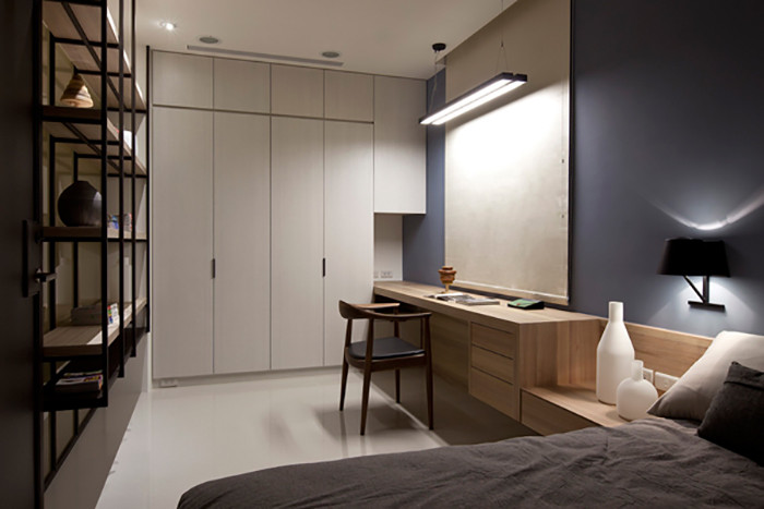 簡潔利落的機(jī)能風(fēng)臥室,體現(xiàn)出私領(lǐng)域簡易卻強(qiáng)大的機(jī)能性,懸空的桌柜體自然地成為空間的腰線,狹長的面積與實(shí)用普照的燈具擁有執(zhí)行工作時(shí)的機(jī)能性,后方的鐵件陳設(shè)架與大衣柜則提供出豐富的收納空間。