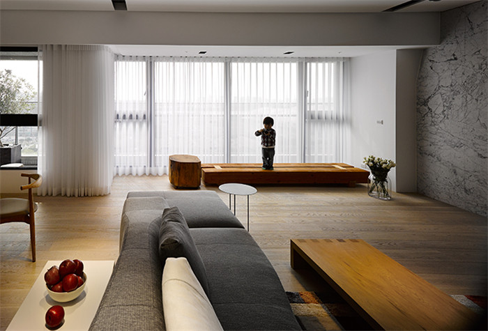 諾大的客廳空間,在大容量與簡約的配置里釋放多余的生活壓力,宛如色票卡的拼布地氈,為石材與木材的沈穩(wěn)調(diào)性增添跳躍式的藝術(shù)色彩。